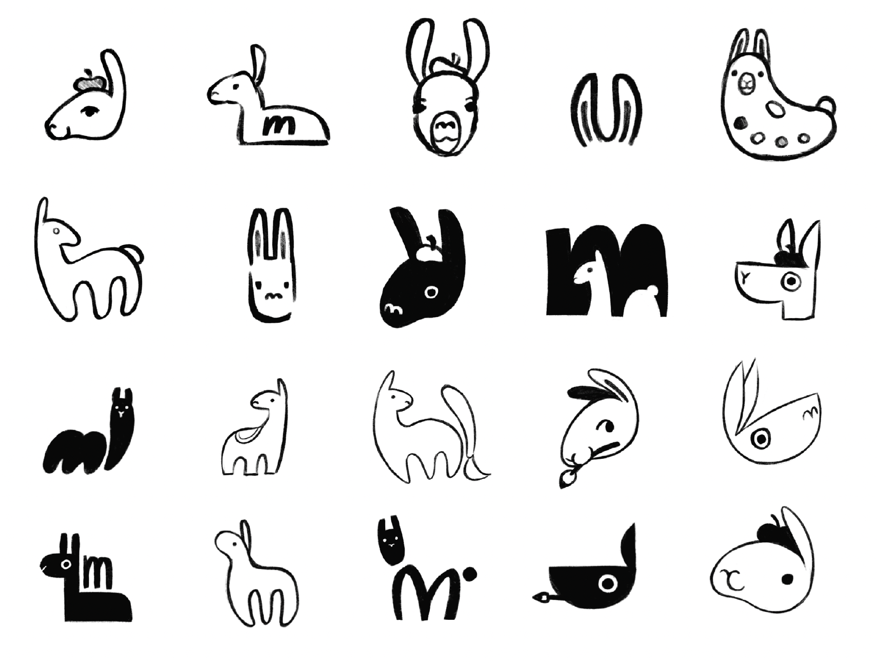 With the mindmap and territory board done, it was time to begin the design process. At the start of this project it was decided that the llama needed to be apart of the logo, so 20 different sketches were explored. Each takes takes into account Mondo Llama's values, and the territory board. Different shapes, compositions, and weights were explored.