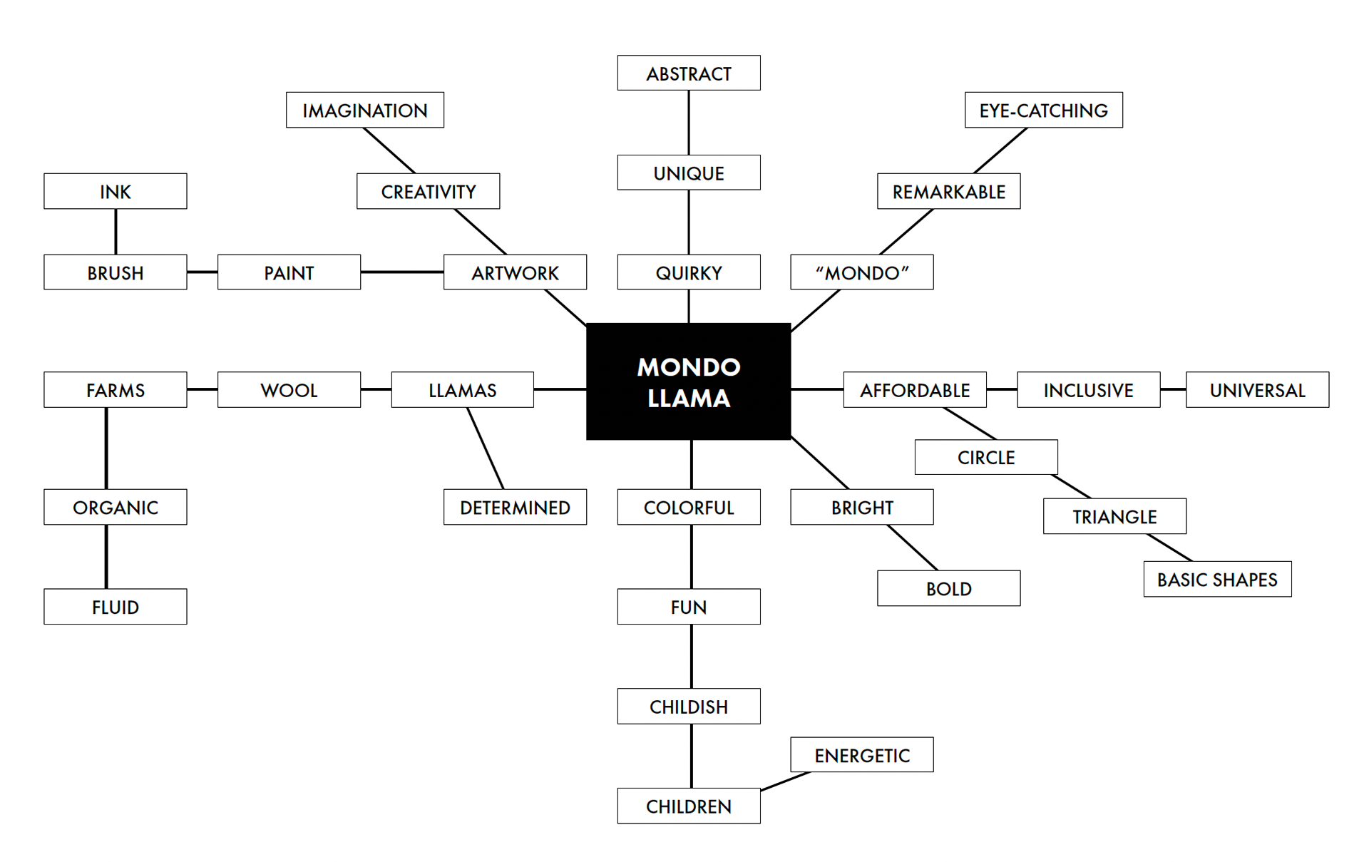 Before the creative process began, a mindmap was created to generate ideas. Many of the words are centered around artwork, colors, and the quirky energy Mondo Llama tries to bring to the arts and crafts market.